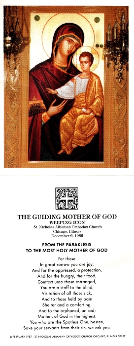 Taped to the top of the icon's picture frame was a commercially printed caption bearing a February 1987 copyright. The text of the caption began: "The Guiding Mother of God Weeping Icon," and indicated that the photograph had been taken in Chicago, on December 6, 1986, at St. Nicholas Albanian Orthodox Church, where the original painting resides. This painting had attracted national attention at St. Nichoias' two years ago when it reportedly began to weep, although church officials had denied requests for a scientific investigation of the affair.