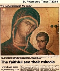 I received a phone call from Channel 10 (WTSP-TV) on July 21 requesting that I meet up with one of their reporters at the Tarpon Springs shrine. So on Monday, July 24, I went to have a first-hand look at the miraculous weeping icon. In my pocket was the large color photograph taken on July 19 that appeared in the St. Petersburg Times on July 20.