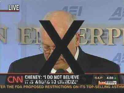June 2006 Afterword: I had been toying for some time with the idea of starting my own blog (or something roughly resembling one). The "kick in the butt" was seeing this graphic (right) that appeared briefly on CNN in November 2005. CNN explained the next day that the "X" was not intended as a commentary on its view of Vice President Cheney, but was rather the result of a technical malfunction. But the climate of discourse in this country has become such that intent, rather than a "glitch," seemed the obvious first choice as an explanation, and that was the straw that broke my back.